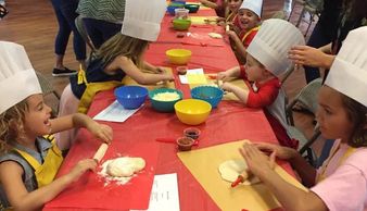 We hold 3 hour intensive classes for 2 weeks only at the end of July. We visit a different country each day. Fridays are fun/treat days. (Baking one week and Choclate the next). Italy, France, China, Mexico, Mediterranean and of course American.